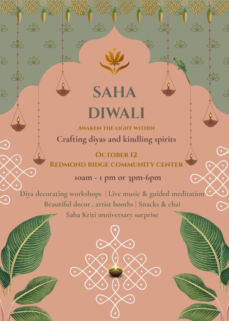 Join Saha Kriti for a family-friendly Diwali art workshop at the Redmond Ridge Community Center. Choose from six unique diya-crafting art forms (including Pichwai jharokha painting), decorate your own diya, and take home your creation. All materials provided. The workshop is led by local artists and is suitable for adults and children.